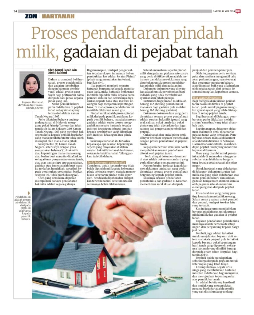 Berita Harian, (5 November 2022) Dato’ Nazri Mustafa, Managing Partner of NAILAW mengupas sedikit tentang Perjanjian Jual Beli bersyarat. Apabila syarat-syarat yang dinyatakan itu dipatuhi, barulah perjanjian jual beli itu mula berkuatkuasa, dan disempurnakan dalam waktu yang dinyatakan. Antara syarat2 common yang biasa dijumpai ialah : 1. Mendapatkan kebenaran pindahmilik; 2. Kebenaran dari pihal ketiga…